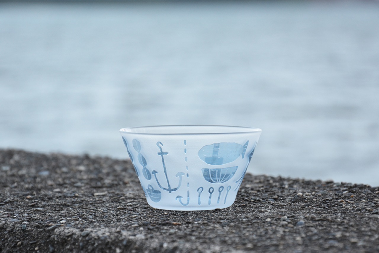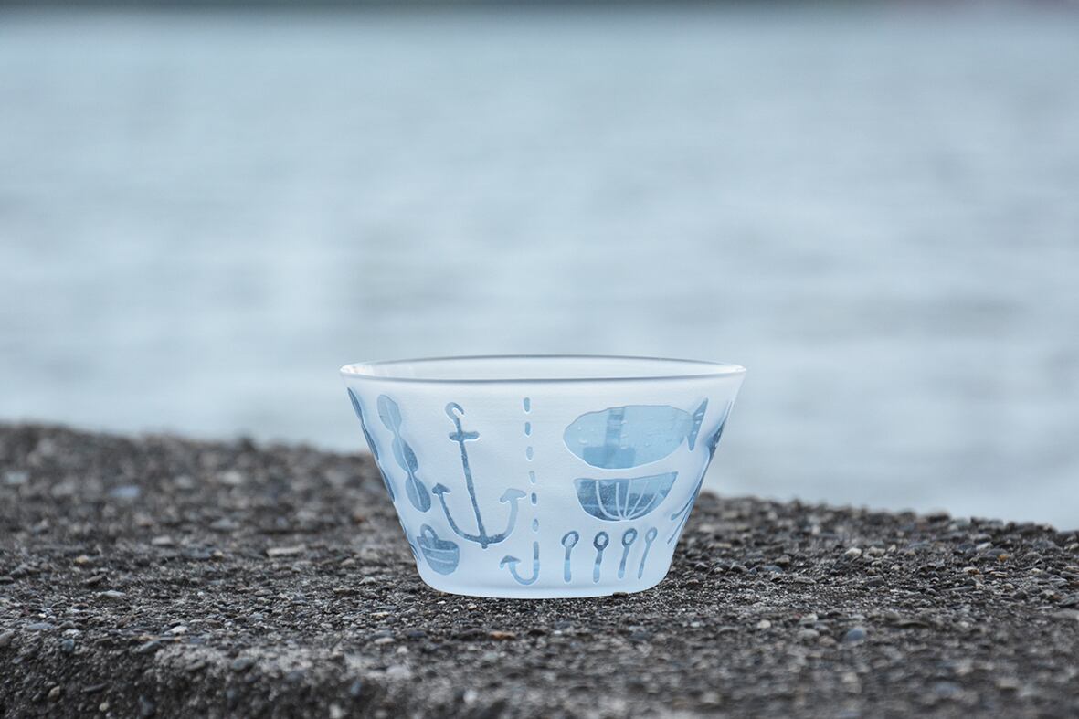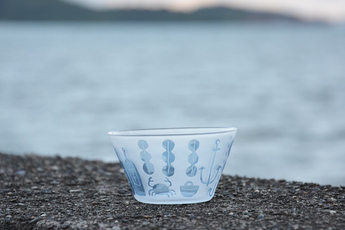 夜に釣り糸を垂らしている海の中の世界と、釣った後の食卓を想像している風景が描かれているデザートカップです。