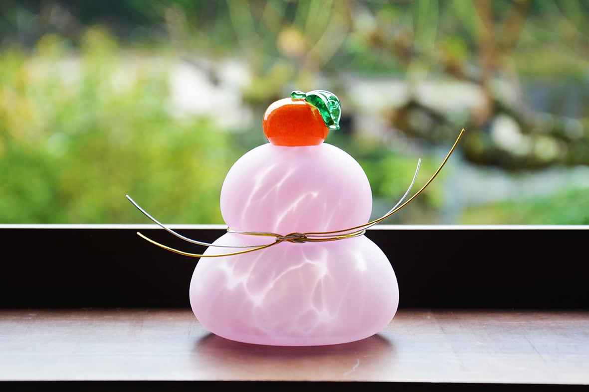 サラサラとした曇りガラスの表情がお餅らしいガラスの鏡餅です。